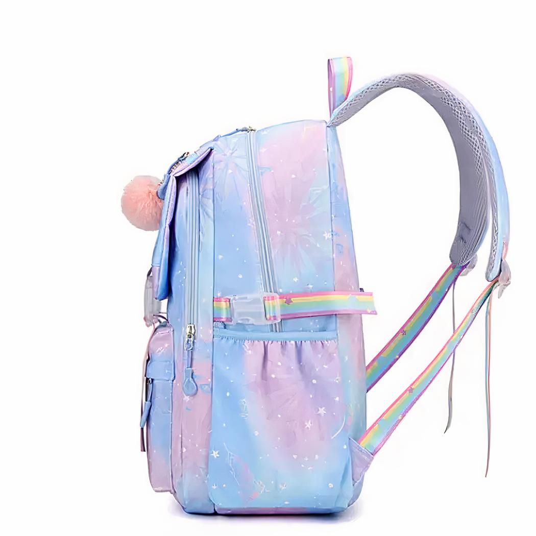 Les couleurs chatoyantes et les motifs féeriques de ce sac à dos feront briller les yeux des enfants. Orné d’un petit pompon rose accroché à la fermeture et doté de lanières aux couleurs arc en ciel, ce sac à dos est une invitation à la magie et à l’émerveillement.
