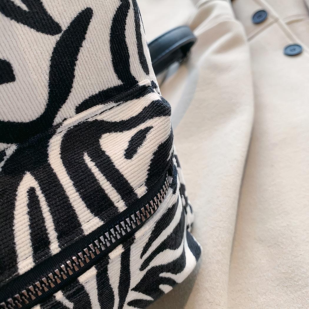 Fabriqué en velours côtelé, il arbore un motif zèbre noir et blanc qui lui donne une allure sophistiquée et tendance. Son design intemporel est rehaussé par des détails en métal argenté et des finitions soignées. Il se ferme à l’aide d’une glissière robuste et pratique et comporte une poche extérieure zippée pour ranger vos effets personnels.